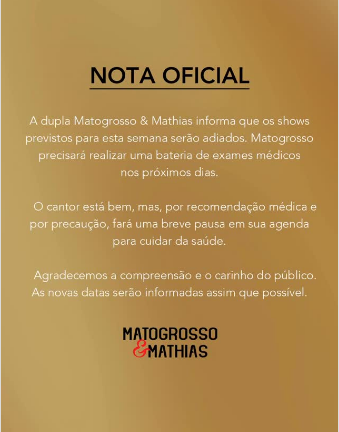 A nota reforça que o cantor está bem, mas, por recomendação médica e por precaução, fará uma breve pausa na agenda para cuidar da saúde. Novas datas serão divulgadas assim que possível.