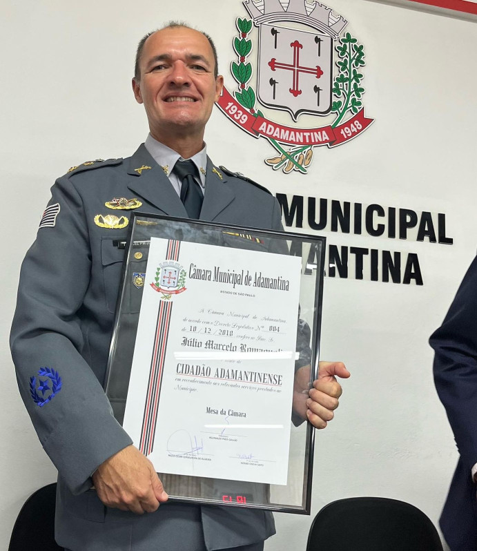 O Tenente-coronel Júlio Marcelo Romagnoli recebeu, nesta terça-feira (7), o título de Cidadão Adamantinense. Maior honraria local a não nascidos em Adamantina, o título foi concedido em 2018, por iniciativa do vereador à época, Acácio Rocha, acompanhado pelos colegas Eder Ruete e Eduardo Fiorillo, sendo aprovado por unanimidade pelo Legislativo municipal.