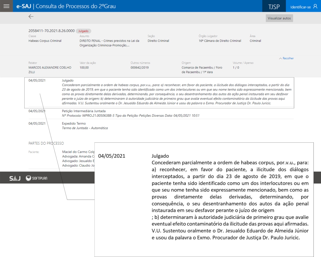 Ao julgar o pedido da defesa do ex-prefeito, o relator expôs e reconheceu em favor de Maciel Colpas a “a ilicitude dos diálogos interceptados, a partir do dia 23 de agosto de 2019, em que o paciente tenha sido identificado como um dos interlocutores ou em que seu nome tenha sido expressamente mencionado, bem como as provas diretamente delas derivadas, determinando, por consequência, o seu desentranhamento dos autos da ação penal instaurada em seu desfavor perante o juízo de origem”.