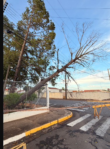 Outros pontos da cidade também registraram ocorrências durante o temporal. Um ipê-branco caiu na Avenida Capitão José Antônio de Oliveira, na região central, em frente ao Conselho Tutelar. Apesar do impacto, nenhuma edificação foi atingida, e a via permaneceu interditada até a remoção dos galhos pelo Corpo de Bombeiros.
