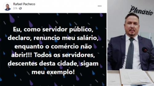 "Eu, como servidor público, declaro, renuncio meu salário, enquanto o comércio não abrir!!! Todos os servidores, descentes desta cidade, sigam meu exemplo!". A postagem repercute nas redes sociais.