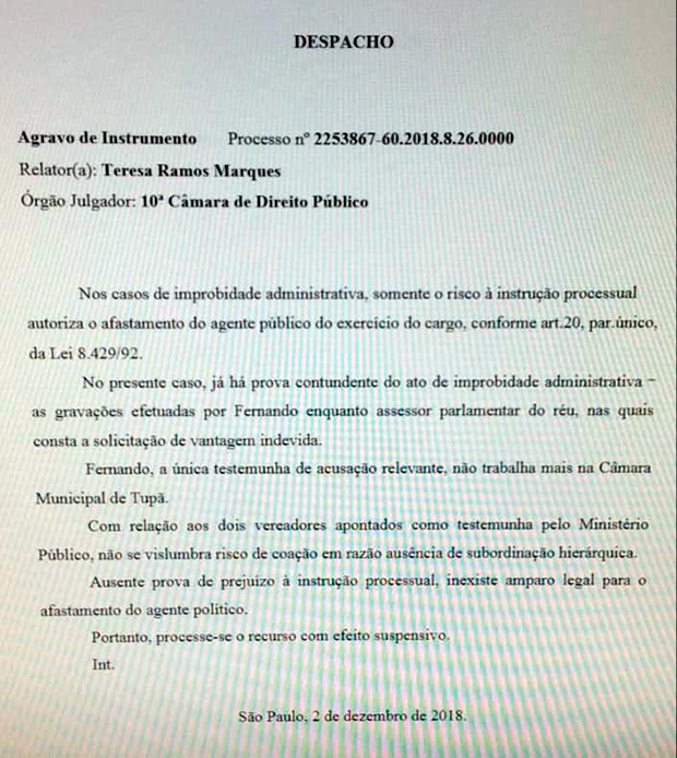 Após notificação do agravo de instrumento, o juiz da Primeira Vara Civil, Alexandre Rodrigues Ferreira, determinou que o vereador Tiago Matias volte ao exercício do seu cargo na Câmara de Tupã.