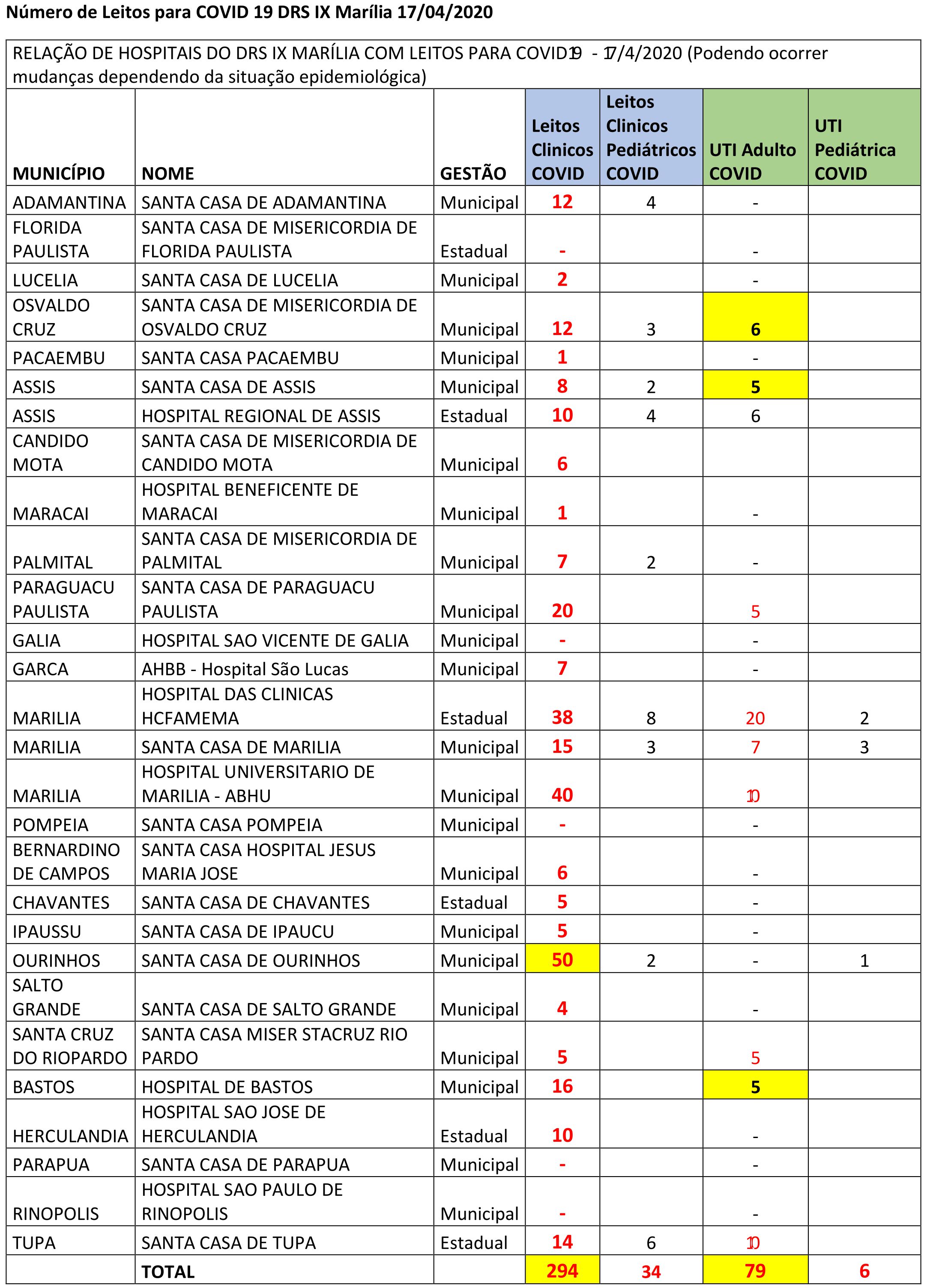 Os 5 leitos existentes na Santa Casa local estão designados para demandas gerais da saúde. Havendo necessidade do suporte intensivo para paciente com Covid-19, é acionada a central de vagas da Divisão Regional de Saúde (DRS) de Marília, órgão da Secretaria Estadual de Saúde na região.