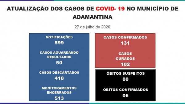 O número de curados subiu para 102 casos. Na última sexta-feira (24), eram 95. Sendo assim, a cidade tem 23 casos ativos da doença. Adamantina não tem nenhum óbito suspeito, pois o que ocorreu na última semana testou negativo para a COVID-19 e com isso, a cidade segue com seis óbitos confirmados.
