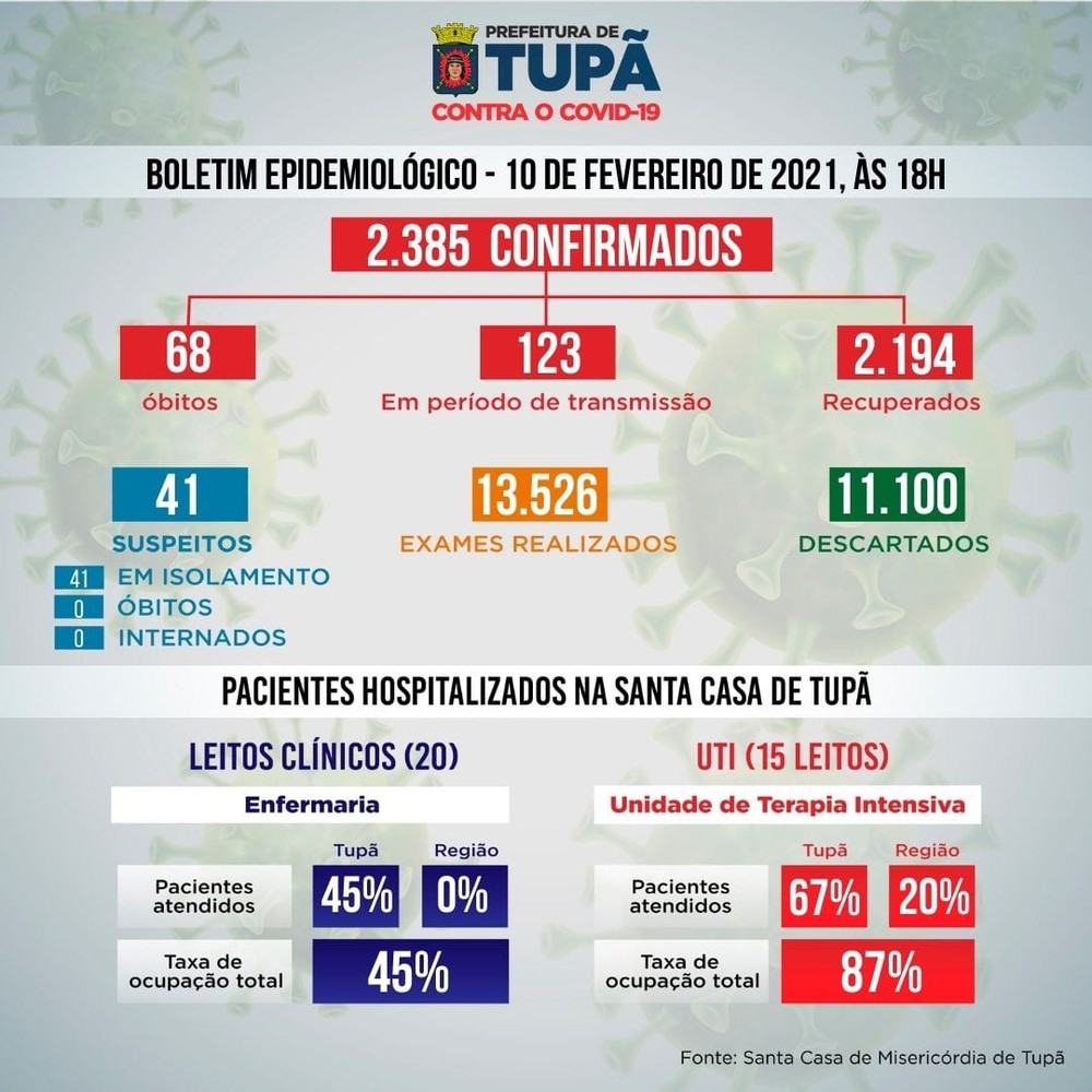 Segundo a prefeitura, o paciente era um homem de 82 anos que estava internado desde o dia 7 de fevereiro na Santa Casa de Tupã. Ao todo, o município registrou 68 óbitos por Covid desde o início da pandemia.
