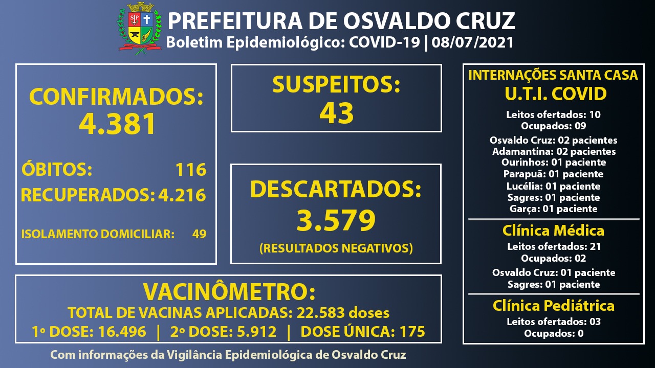 A Santa Casa de Osvaldo Cruz informou no final da tarde desta quinta-feira (08) que os leitos de UTI-Covid estavam com 90% de ocupação. Das 10 vagas oferecidas, nove estavam ocupadas sendo dois paciente de Osvaldo Cruz, dois de Adamantina, um de Parapuã, um de Sagres, um de Lucélia, um de Ourinhos, e um de Garça.