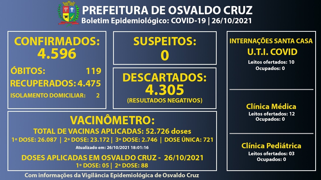 De acordo com o Boletim divulgado no início da noite desta terça-feira (26), Osvaldo Cruz registrou 4.596 casos positivos de Covid-19 desde o início da pandemia. Com relação aos recuperados, eram 4.475. Ainda segundo o boletim, não havia casos suspeitos da doença.