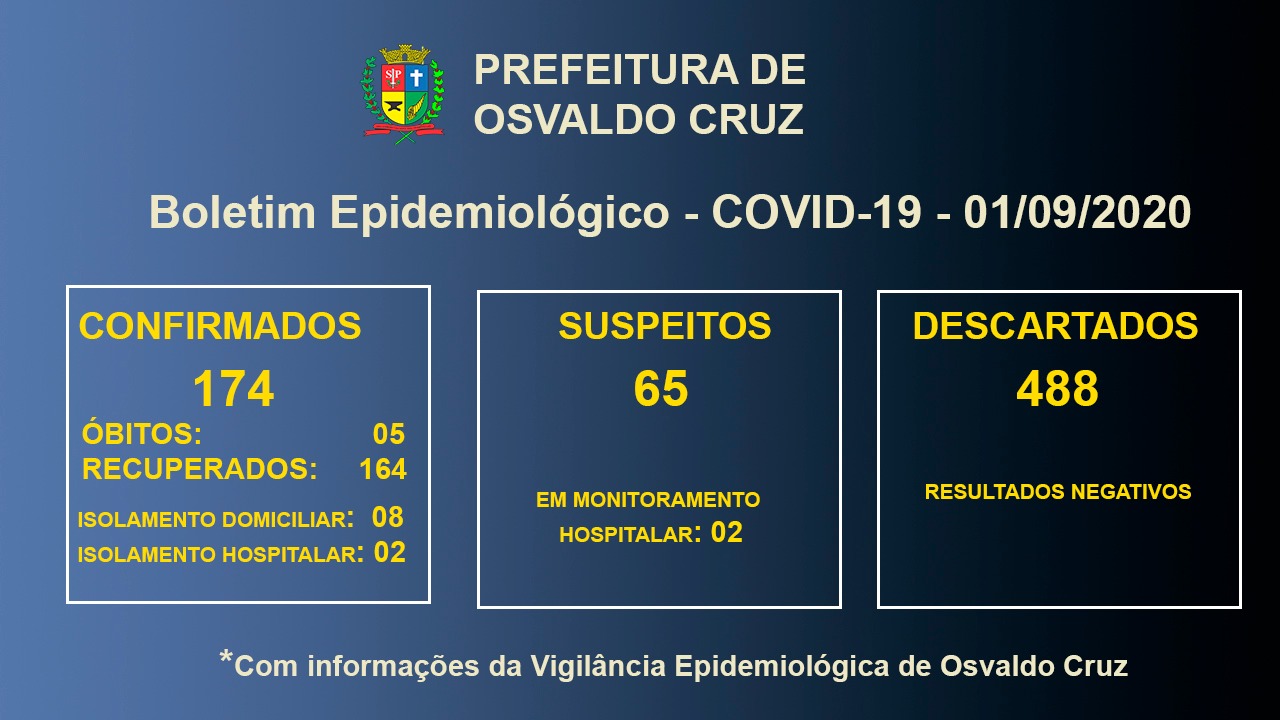 A Prefeitura de Osvaldo Cruz, através da Vigilância Epidemiológica, divulgou Boletim Informativo sobre o novo Coronavírus no final da tarde desta terça-feira (01), que mostra que a cidade registra 174 casos positivos de covid-19. Um aumento de 14 casos desde o último balanço.