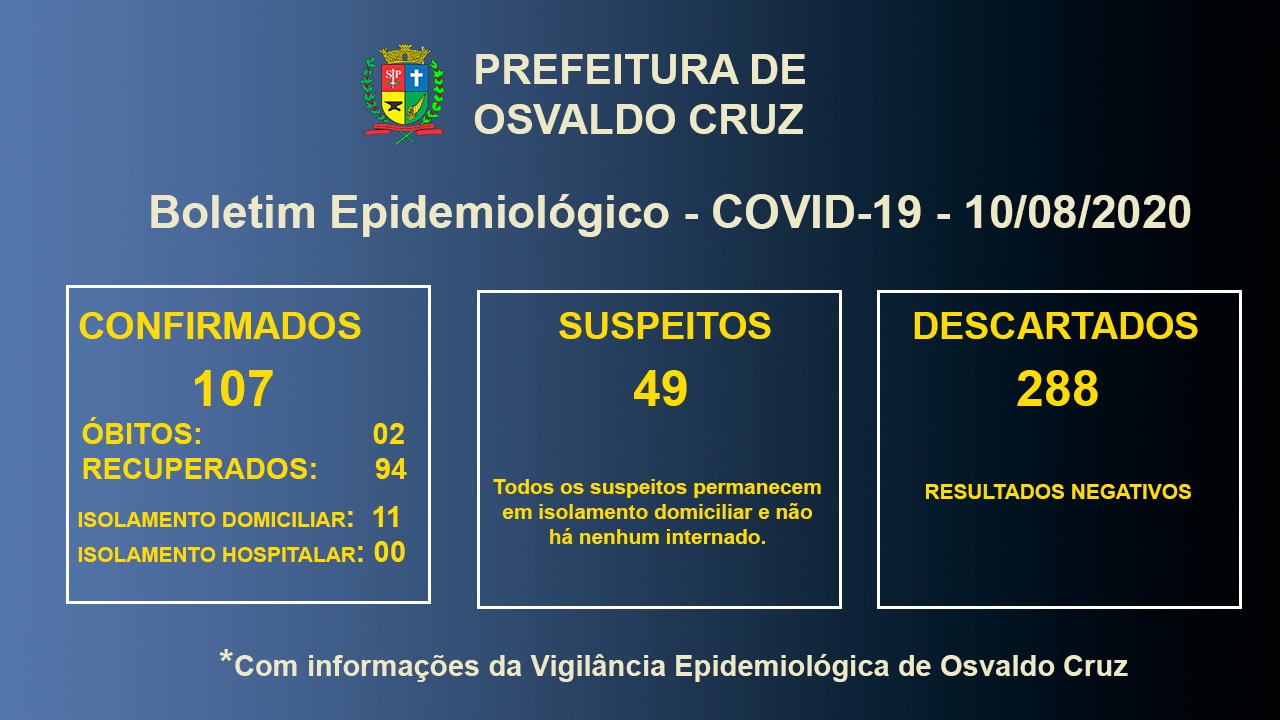 Os pacientes já recuperados da doença somam 94, e 11 pessoas estão em tratamento e isolamento domiciliar em Osvaldo Cruz. Outras 49 pessoas ainda aguardam resultados de exames e 288 casos foram descartados. Dois óbitos são registrados em Osvaldo Cruz.