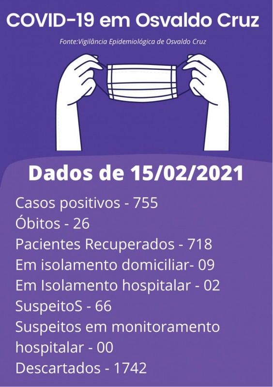 A Prefeitura de Osvaldo Cruz, através da Vigilância Epidemiológica, divulgou Boletim Informativo sobre o novo Coronavírus na tarde desta segunda-feira (15), que mostra que a cidade registra 755 casos positivos de covid-19.