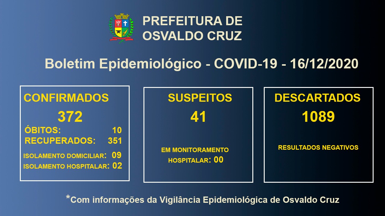 A Prefeitura de Osvaldo Cruz, através da Vigilância Epidemiológica, divulgou Boletim Informativo sobre o novo Coronavírus na tarde desta quarta-feira (16), que mostra que a cidade registra 372 casos positivos de covid-19.
