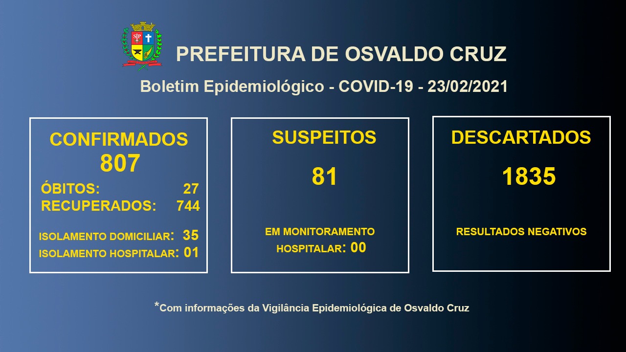 A Prefeitura de Osvaldo Cruz, através da Vigilância Epidemiológica, divulgou Boletim Informativo sobre o novo Coronavírus na tarde desta terça-feira (23), que mostra que a cidade registra 807 casos positivos de covid-19.