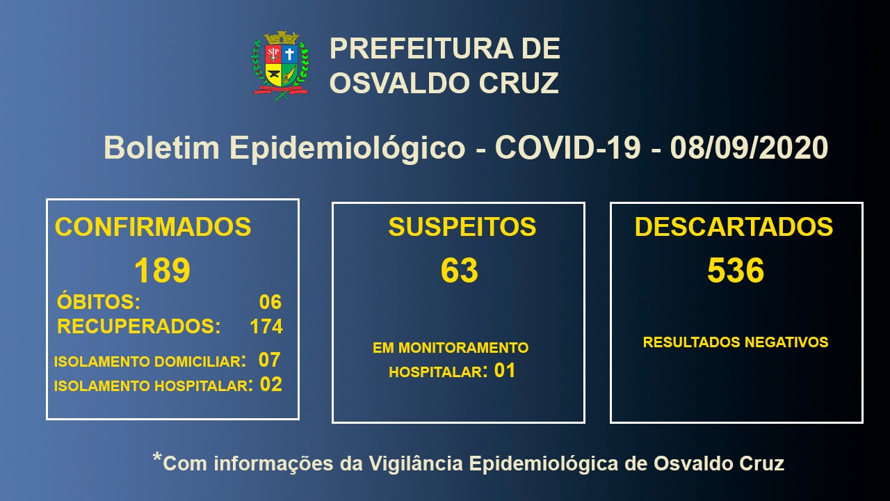 A Prefeitura de Osvaldo Cruz, através da Vigilância Epidemiológica, divulgou Boletim Informativo sobre o novo Coronavírus no final da tarde desta terça-feira (08), que mostra que a cidade registra com 189 casos positivos de covid-19. Um aumento de 10 casos desde o último balanço.