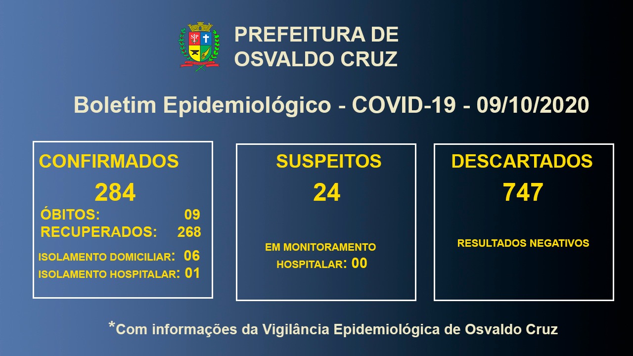 A Prefeitura de Osvaldo Cruz, através da Vigilância Epidemiológica, divulgou Boletim Informativo sobre o novo Coronavírus na tarde desta sexta-feira (09), que mostra que a cidade registra 284 casos positivos de covid-19.