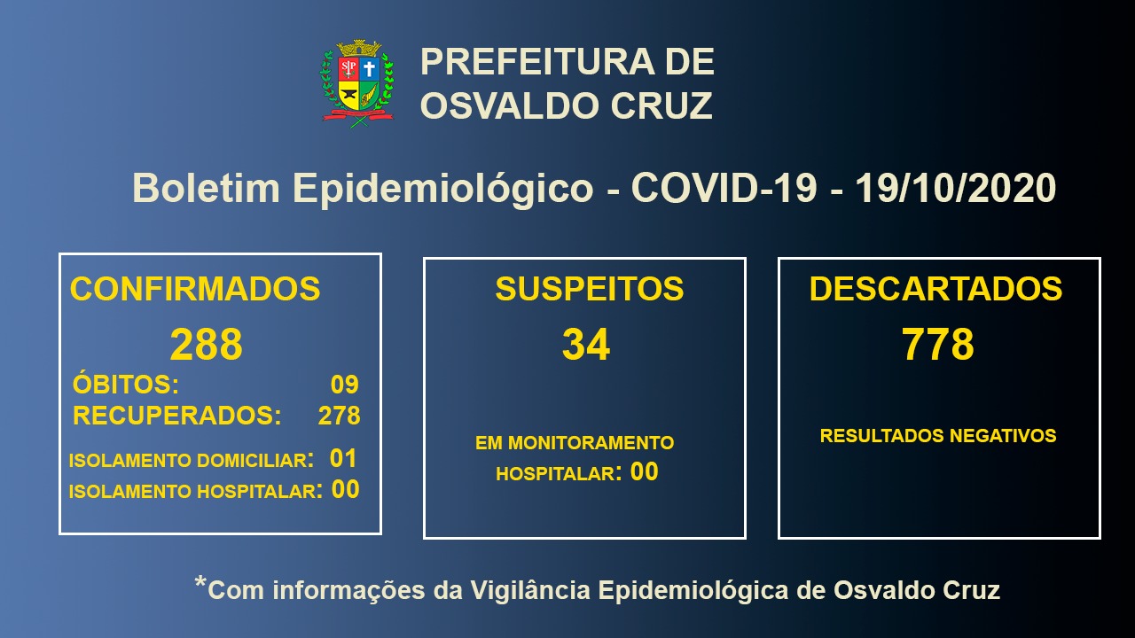 A Prefeitura de Osvaldo Cruz, através da Vigilância Epidemiológica, divulgou Boletim Informativo sobre o novo Coronavírus na tarde desta segunda-feira (19), que mostra que a cidade registra 288 casos positivos de covid-19.