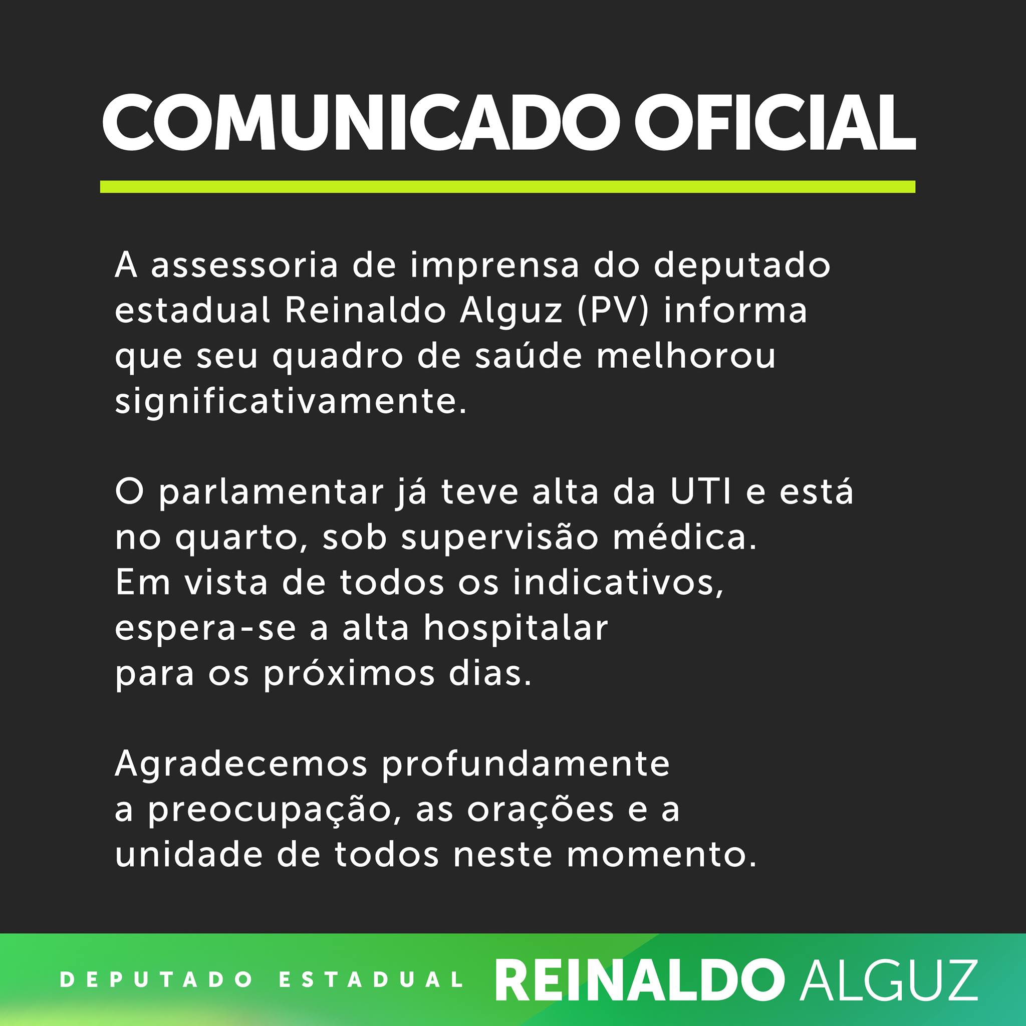 O quadro de saúde do deputado estadual Reinaldo Alguz (PV), que contraiu a Covid-19, apresentou melhoras, segundo divulgou nesta terça-feira (24) sua assessoria, em publicação na fanpage oficial do parlamentar.