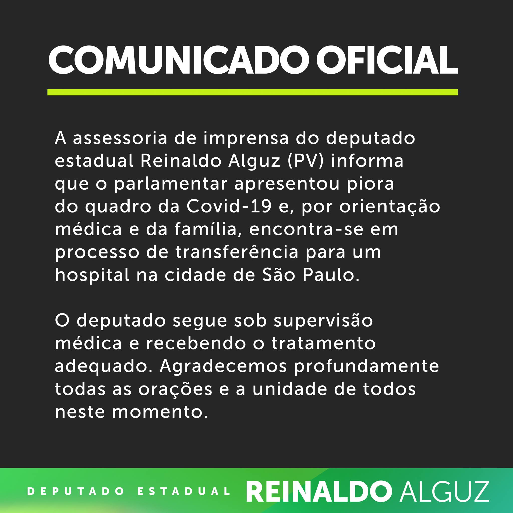 O quadro de saúde do deputado estadual Reinaldo Alguz (PV), que estava hospitalizado em Dracena desde segunda-feira da semana passada, 9 de novembro, em decorrência da Covid-19, apresentou piora e o parlamentar foi transferido para um hospital na capital paulista. Essa nova atualização sobre o quadro de saúde de Alguz e sua remoção a São Paulo foi divulgada por sua assessoria nesta segunda-feira (16) em sua página oficial no Facebook.