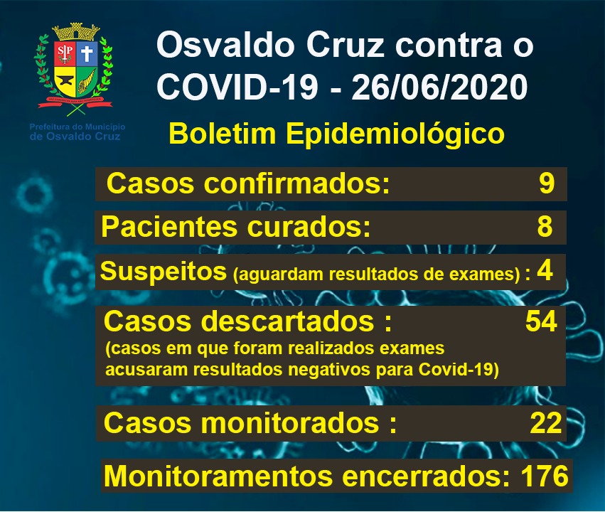 Novo Boletim Epidemiológico divulgado nna tarde desta sexta-feira (26) pela Prefeitura de Osvaldo Cruz, mostra que o município continua com nove casos positivos do novo Coronavírus (Covid-19).