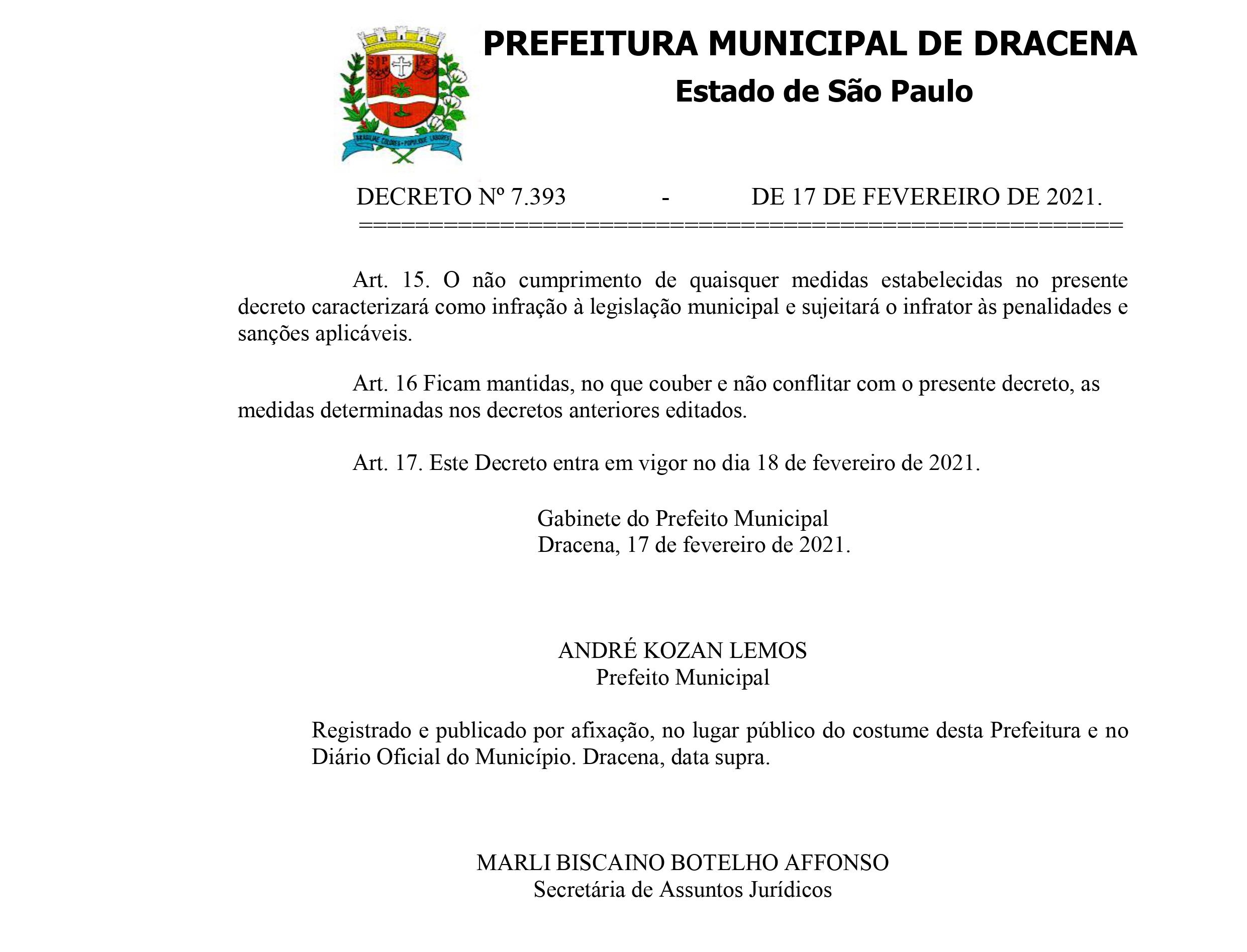 Segundo a Rádio Liberal FM de Dracena, a assessoria do prefeito passou a informação que de segunda a sexta acontecerá toque de recolher na cidade, das 20h às 5h, e que aos finais de semana, somente farmácias podem abrir, todos os outros comércios, inclusive supermercados, devem permanecer fechados. não haverá serviços delivery e drive-thru. Medidas serão tomadas por tempo indeterminado.