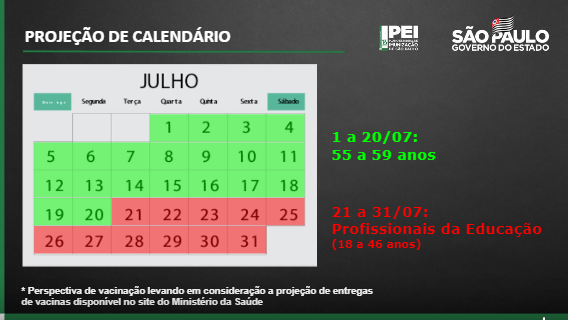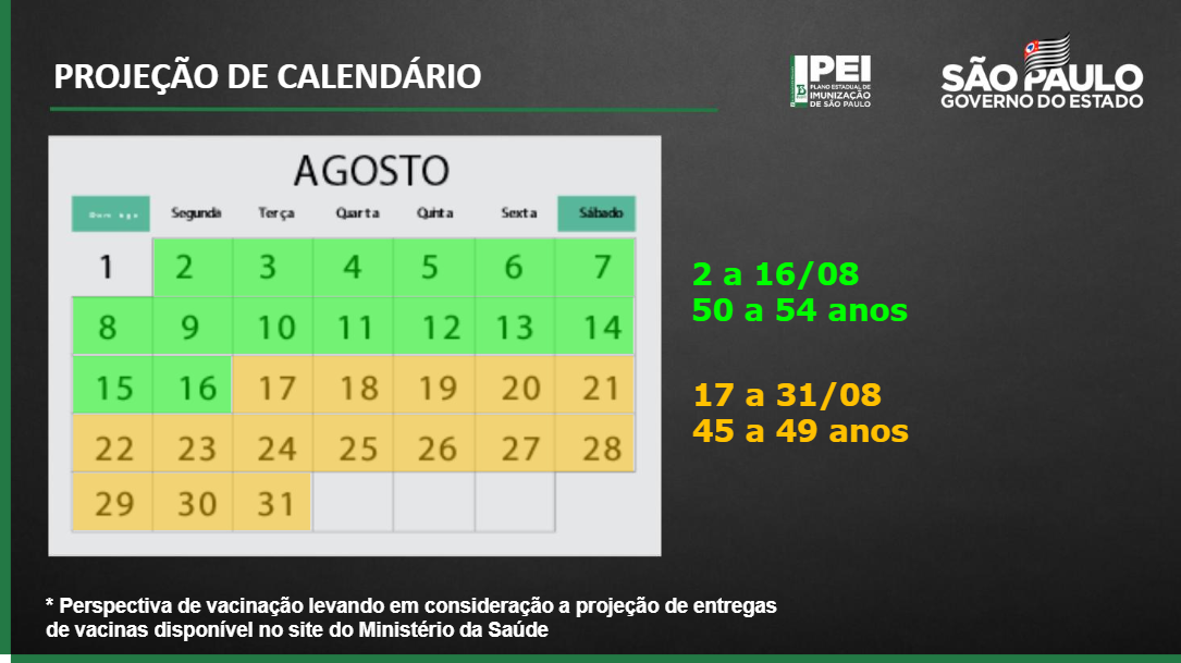 Durante a coletiva de imprensa no começo da tarde de ontem (26),o governo do estado de São Paulo apresentou nova projeção de vacinação contra a Covid-19 para os meses de julho e agosto. A perspectiva de vacinação leva em consideração o calendário com a projeção de entregas de vacinas, disponível no site do Ministério da Saúde.