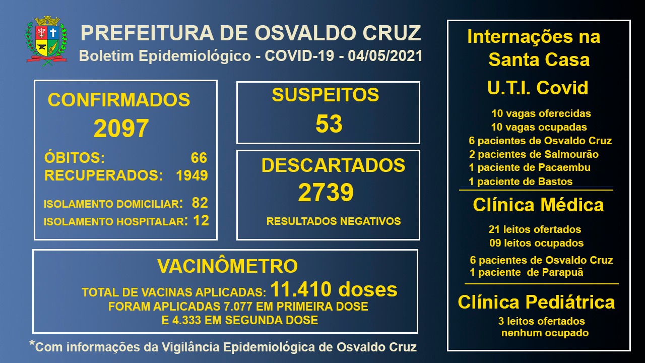 No último boletim informativo sobre a Covid-19 divulgado nesta terça-feira (04) pela Vigilância Epidemiológica de Osvaldo Cruz, o município registrava 2.097 casos positivos do novo coronavírus desde o início da pandemia com 1.949 pacientes curados.