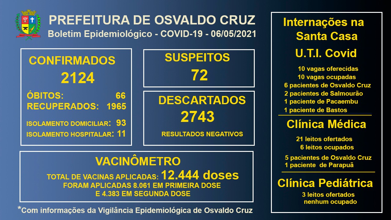 A Santa Casa de Osvaldo Cruz informou no final da tarde desta quinta-feira (06) que os leitos de UTI-Covid permaneciam com 100% de ocupação. Das 10 vagas oferecidas, seis pacientes internados são de Osvaldo Cruz, dois de Salmourão, um de Pacaembu e um de Bastos.