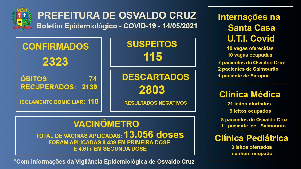 A Santa Casa de Osvaldo Cruz informou no final da tarde desta sexta-feira (14) que os leitos de UTI-Covid permaneciam com 100% de ocupação. Das 10 vagas oferecidas, sete pacientes internados são de Osvaldo Cruz, dois de Salmourão e um de Parapuã.