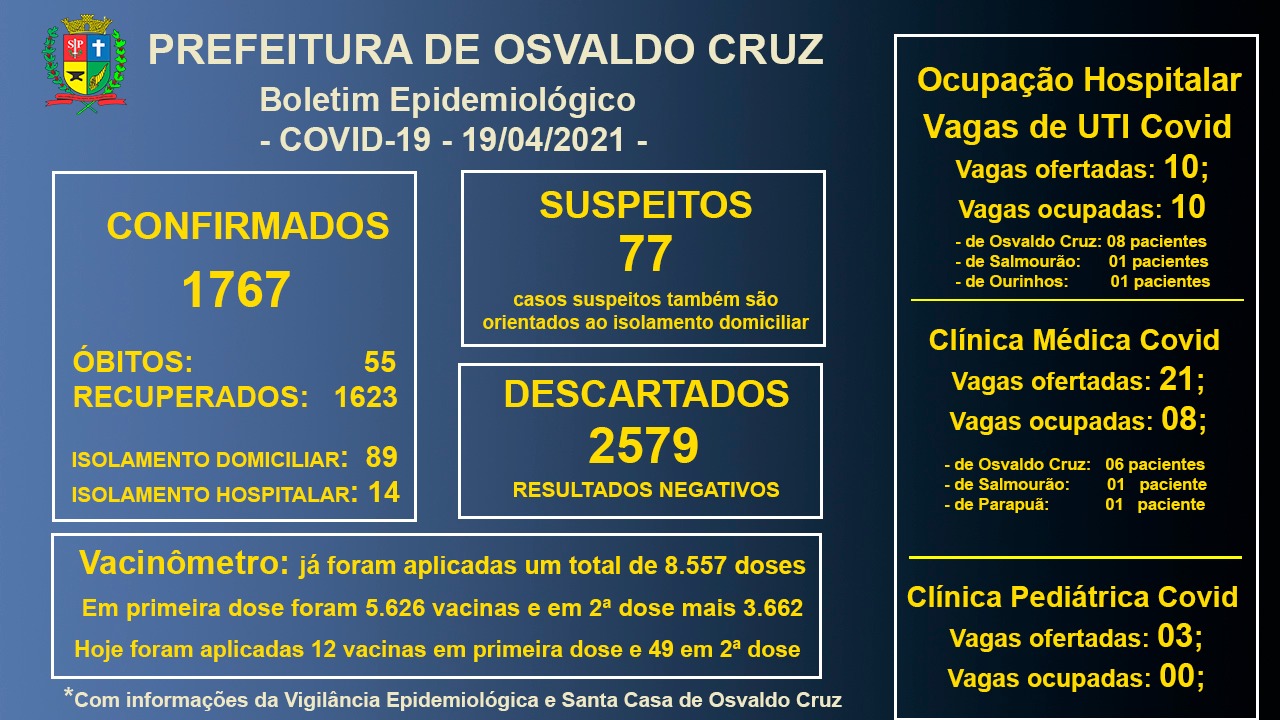 No último boletim informativo sobre a Covid-19 divulgado nesta segunda-feira (19) pela Vigilância Epidemiológica de Osvaldo Cruz, o município registrava 1.767 casos positivos do novo coronavírus desde o início da pandemia com 1.623 pacientes curados.