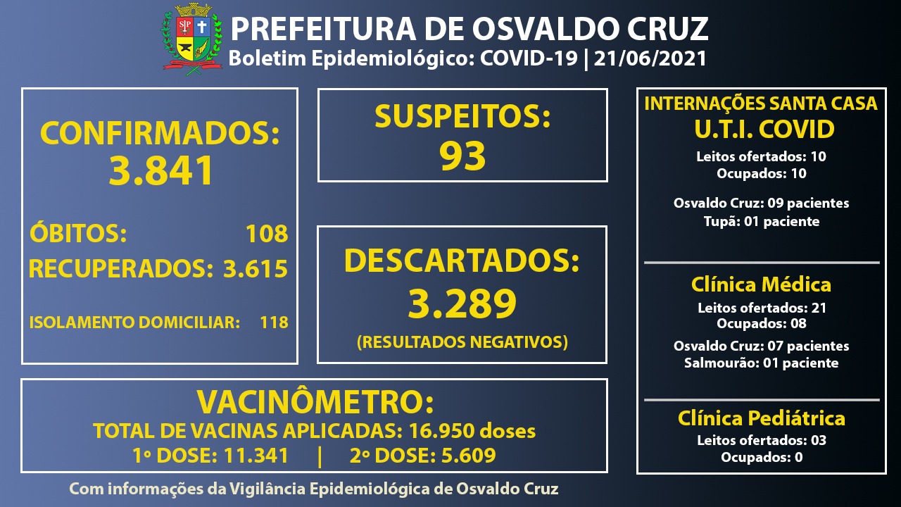 Com relação aos leitos clínicos para Covid-19, das 21 vagas oferecidas oito estavam ocupadas, sendo sete pacientes de Osvaldo Cruz e um de Salmourão.