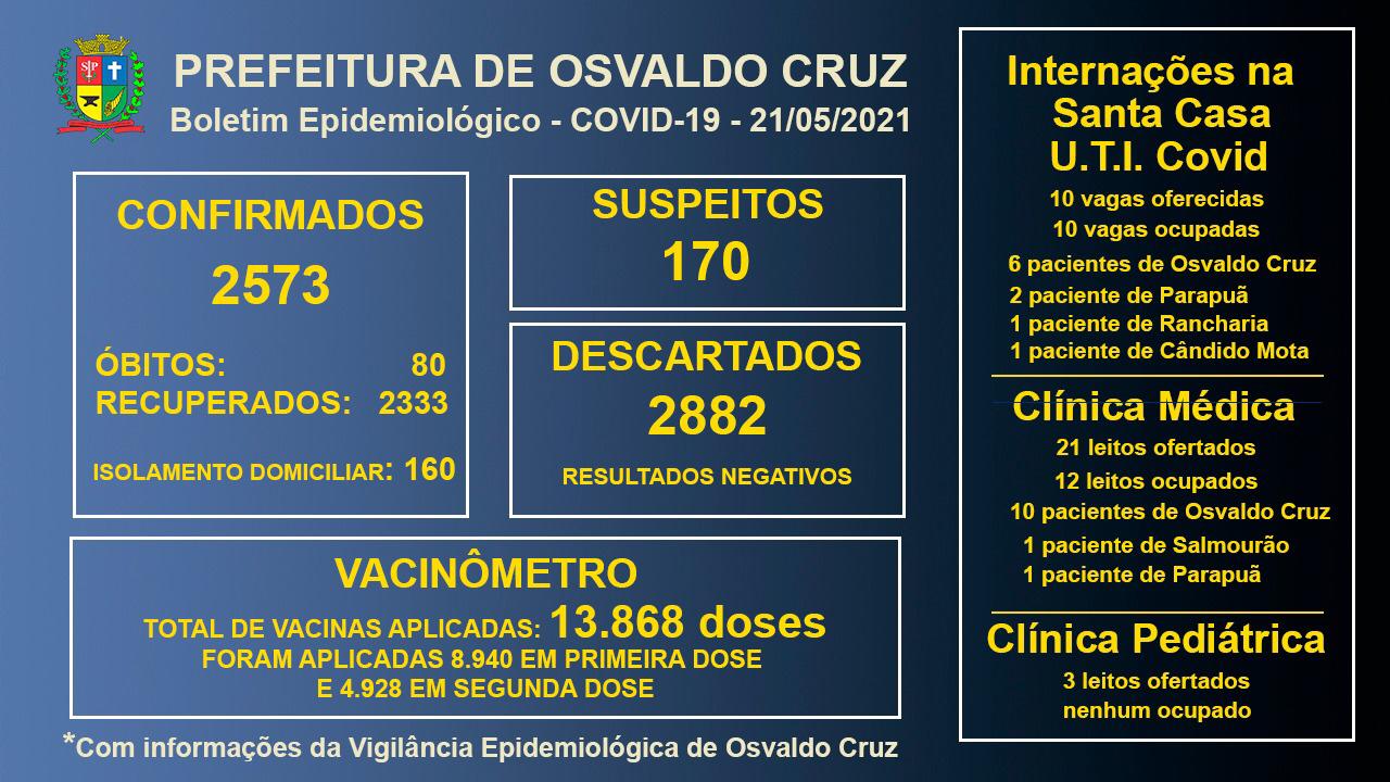 Já com relação aos leitos clínicos para Covid-19, das 21 vagas oferecidas 12 estavam ocupadas, sendo 10 pacientes de Osvaldo Cruz, um de Salmourão e um de Parapuã.