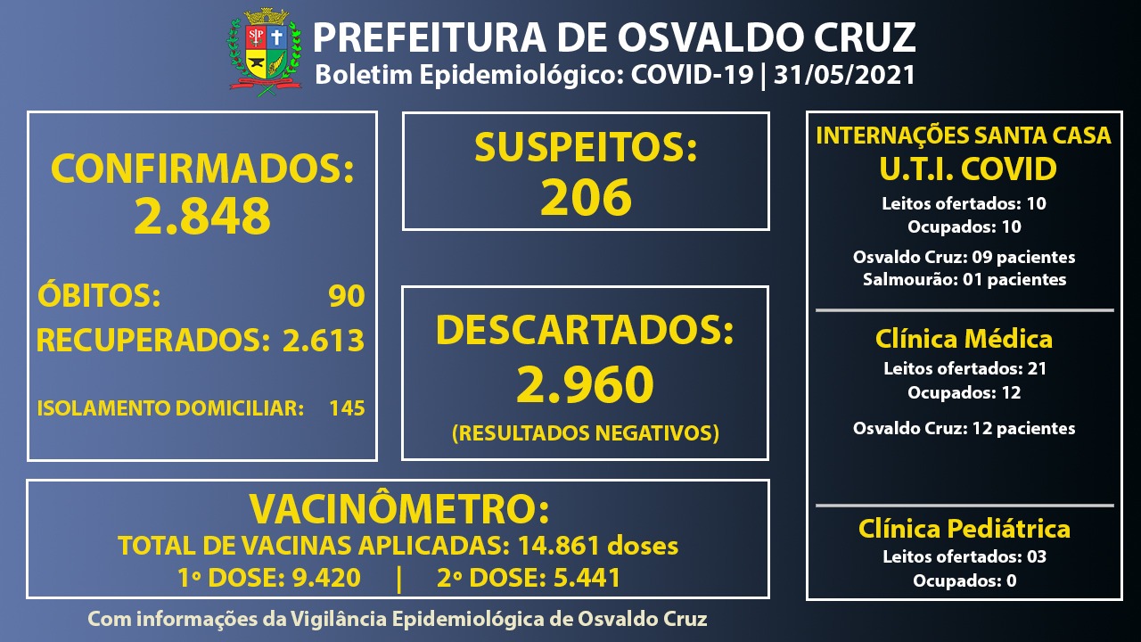 A Santa Casa de Osvaldo Cruz informou no final da tarde desta segunda-feira (31) que os leitos de UTI-Covid permaneciam com 100% de ocupação. Das 10 vagas oferecidas, nove pacientes internados são de Osvaldo Cruz e um de Salmourão.