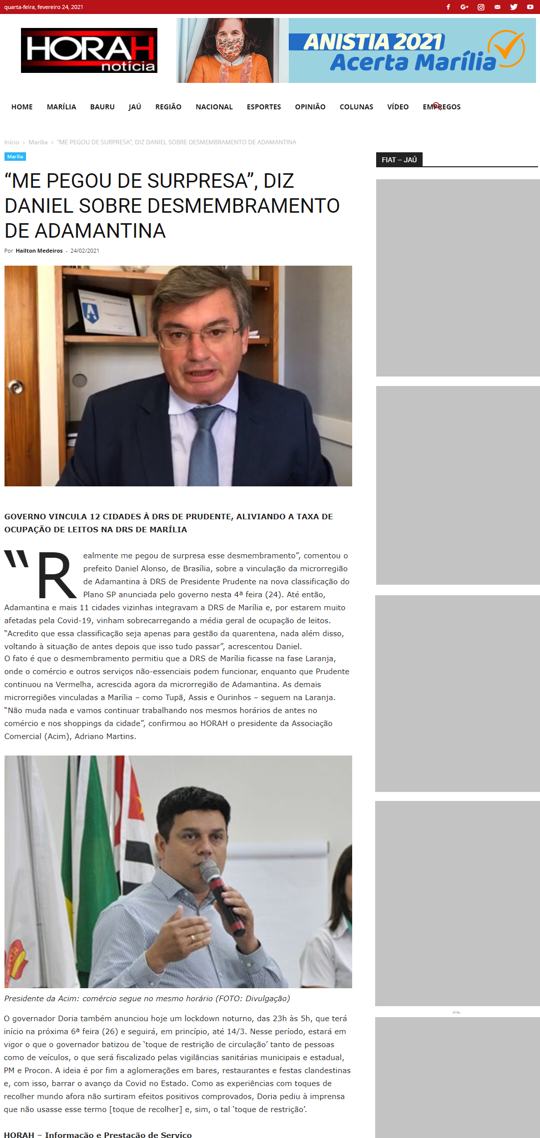 O Hora H Notícia publicou que a medida teria divulgada pelo governo estadual nesta quarta-feira durante o anúncio da reclassificação das regiões de saúde (DRS), em atualização do Plano SP, e aliviaria a taxa de ocupação de leitos na DRS de Marília. “Até então, Adamantina e mais 11 cidades vizinhas integravam a DRS de Marília e, por estarem muito afetadas pela Covid-19, vinham sobrecarregando a média geral de ocupação de leitos”, diz o conteúdo publicado. “O fato é que o desmembramento permitiu que a DRS de Marília ficasse na fase Laranja, onde o comércio e outros serviços não-essenciais podem funcionar, enquanto que Prudente continuou na Vermelha, acrescida agora da microrregião de Adamantina”, continua a publicação.