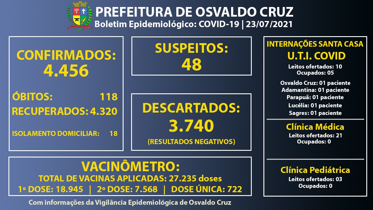 A Santa Casa de Osvaldo Cruz informou para a imprensa no final da tarde desta sexta-feira (23), que a ocupação dos leitos de UTI Covid segue em 50%.
