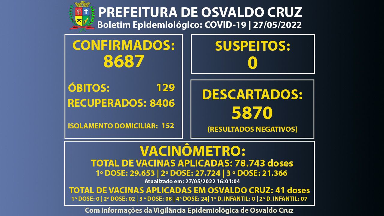 A Vigilância Epidemiológica de Osvaldo Cruz atualizou no final da tarde desta sexta-feira (27) os dados da pandemia no município.