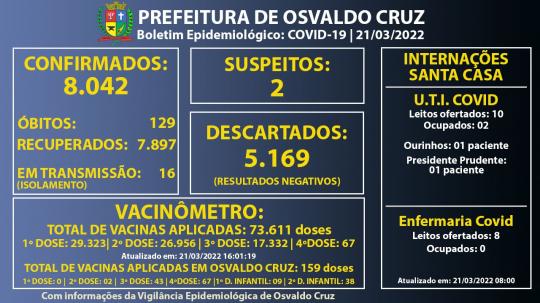 Segundo informações do Boletim Epidemiológico, Osvaldo Cruz chegou a 8.042 casos positivos da doença, com 16 pessoas ainda em fase de transmissão. São 129 mortes causadas por Covid-19 desde o início da pandemia, sendo 10 somente neste ano.