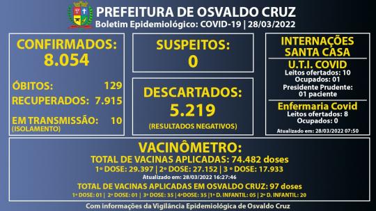 A Vigilância Epidemiológica de Osvaldo Cruz atualizou no final da tarde desta segunda-feira (28) os dados da pandemia no município.