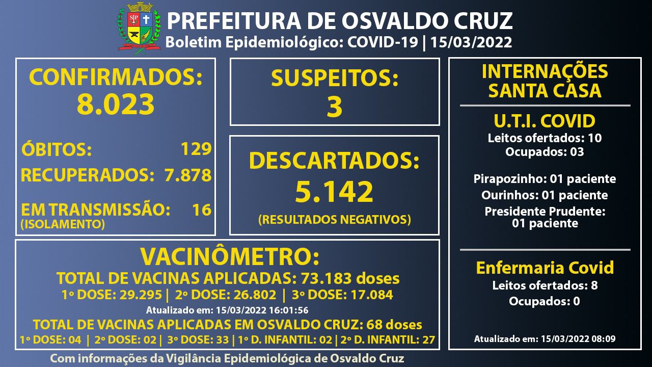 Segundo informações do Boletim Epidemiológico, Osvaldo Cruz chegou a 8.023 casos positivos da doença, com 16 pessoas ainda em fase de transmissão. São 129 mortes causadas por Covid-19 desde o início da pandemia, sendo 10 somente neste ano.