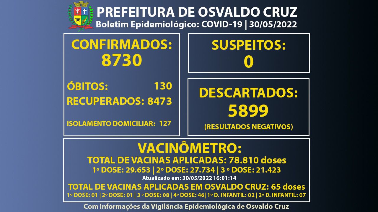 A Vigilância Epidemiológica de Osvaldo Cruz atualizou no final da tarde desta segunda-feira (30) os dados da pandemia no município.