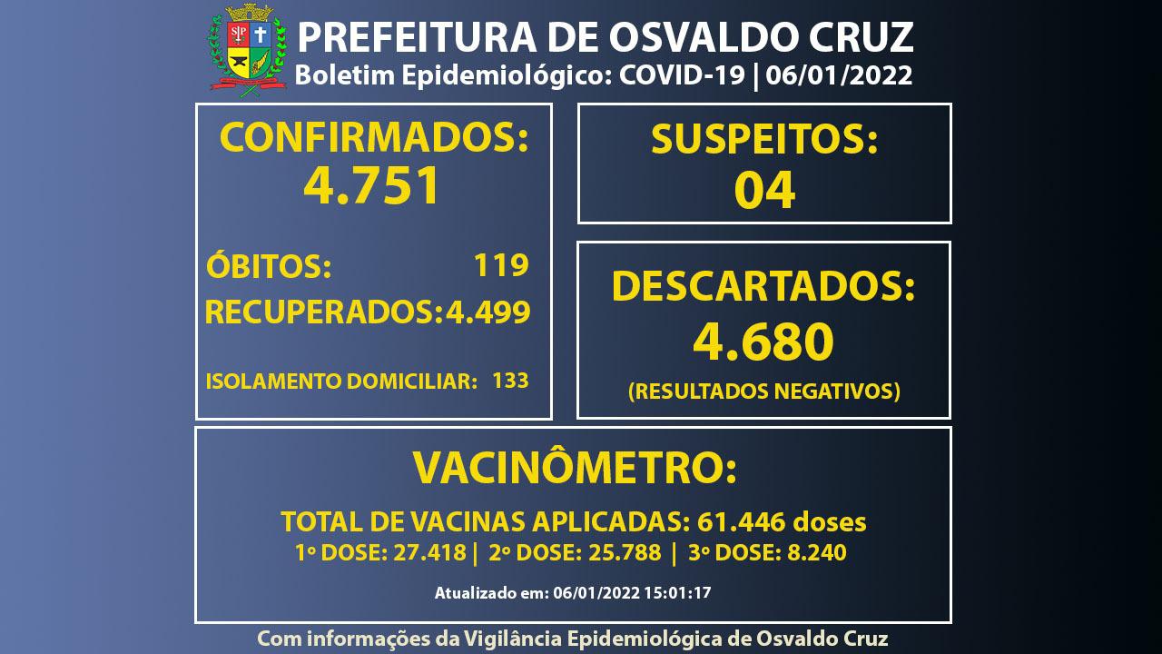 De acordo com o Boletim divulgado no final da tarde desta quinta-feira (06), Osvaldo Cruz havia registrado 4.751 casos positivos de Covid-19 desde o início da pandemia.
