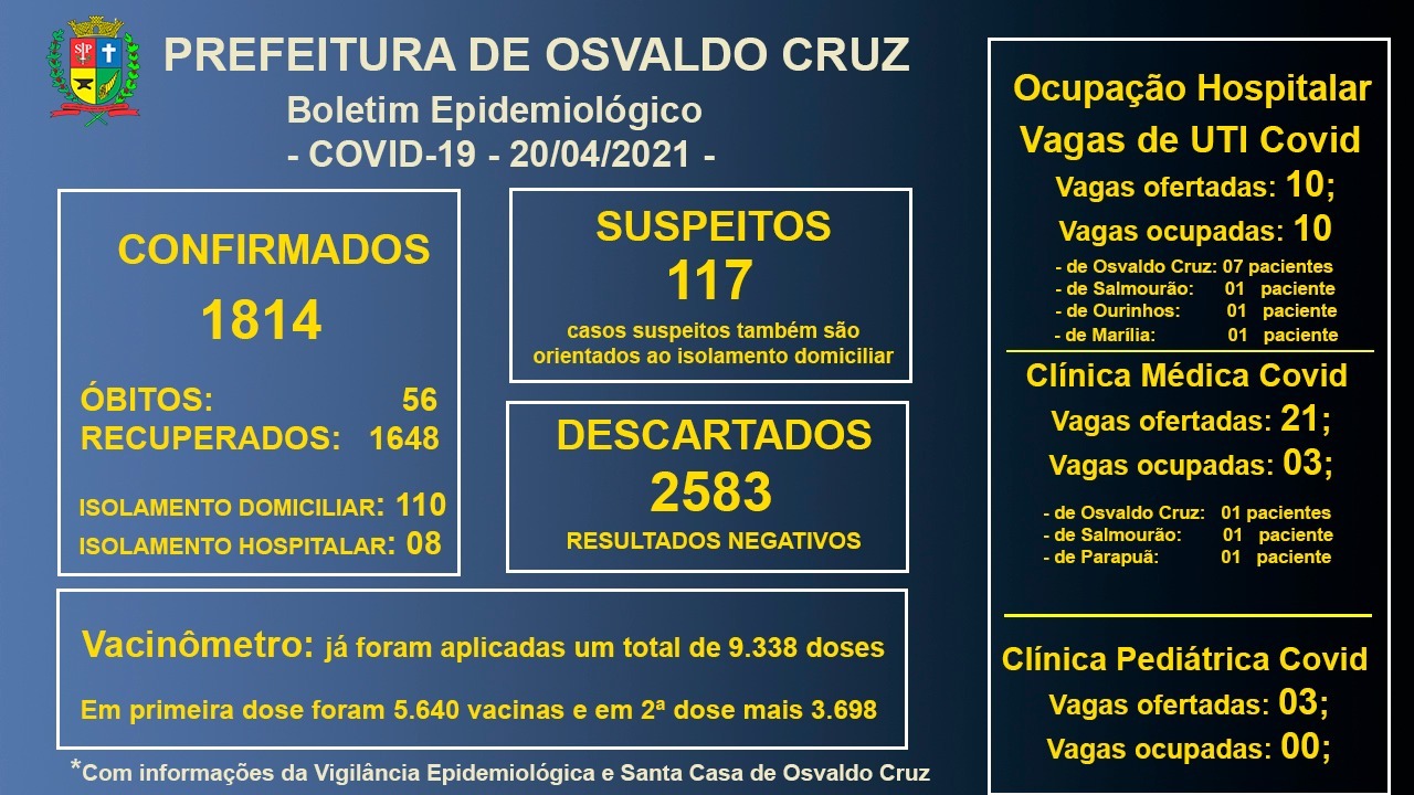 Desde o início da pandemia, de acordo com o último Boletim Informativo divulgado pela Vigilância Epidemiológica de Osvaldo Cruz nesta terça-feira (20), foram registrados 1.814 casos positivos, com 1.648 recuperados. Dos 118 casos ainda ativos da doença, 8 estão em isolamento hospitalar e 117 pessoas ainda aguardam resultados de exames. Agora são 56 óbitos causados por complicações da doença.
