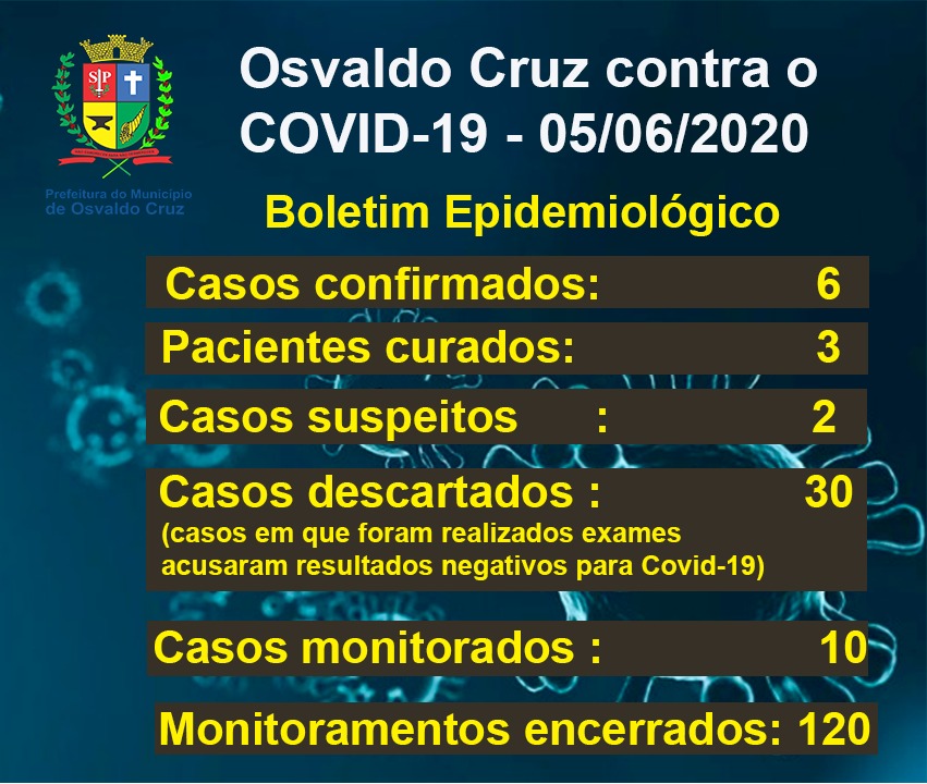 Em novo boletim epidemiológico divulgado na tarde desta sexta-feira (05) pela Assessoria de Imprensa da Prefeitura de Osvaldo Cruz, consta mais dois casos confirmados do novo coronavírus (Covid-19) no município. Não foram passadas mais informações sobre o perfil dos infectados.