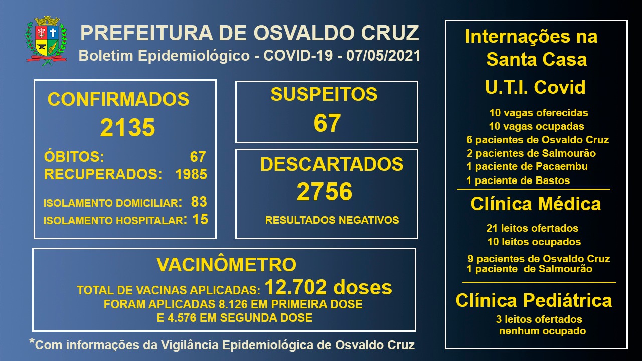 Desde o início da pandemia, de acordo com o último Boletim Informativo divulgado pela Vigilância Epidemiológica de Osvaldo Cruz nesta sexta-feira (07), foram registrados 2.135 casos positivos, com 1.985 recuperados. Dos 98 casos ainda ativos da doença, 15 estão em isolamento hospitalar e 67 pessoas ainda aguardam resultados de exames. Agora são 67 óbitos causados por complicações da doença.