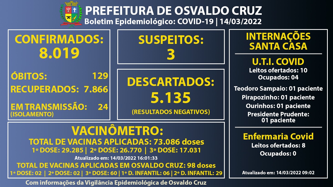 Ainda de acordo com o Boletim, Osvaldo Cruz chegou a 8.019 casos positivos da doença, com 24 pessoas ainda em fase de transmissão.