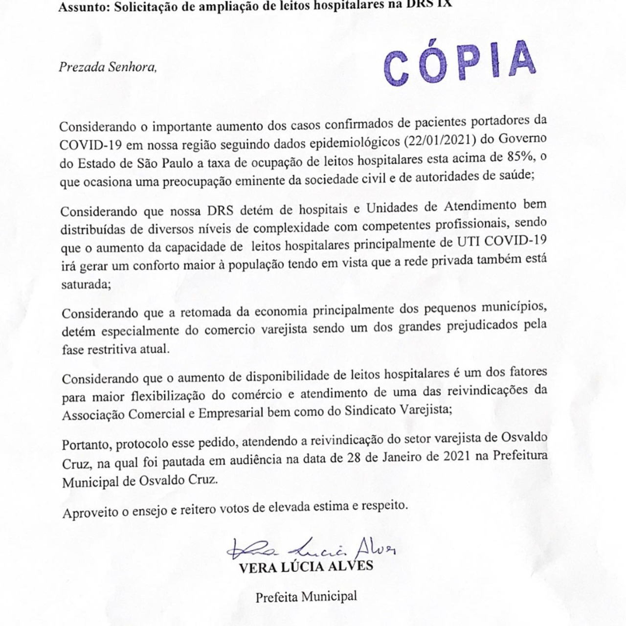 O atendimento da reivindicação é após entrega de pedidos por parte da Prefeitura de Osvaldo Cruz e outro documento da Câmara Municipal, após reunião ocorrida na quinta-feira passada entre a Prefeita e os vereadores.