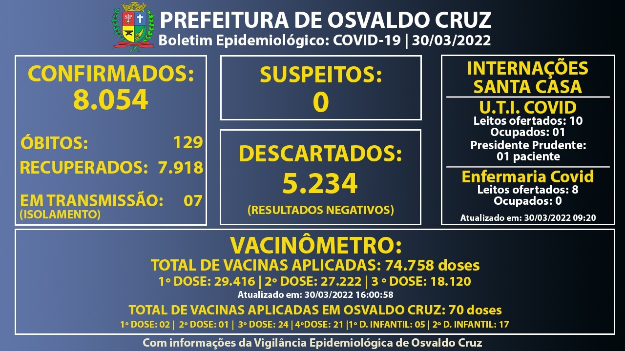 A Vigilância Epidemiológica de Osvaldo Cruz atualizou no final da tarde desta quarta-feira (30) os dados da pandemia no município.