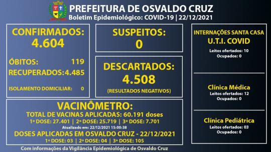 De acordo com o Boletim divulgado no final da tarde desta quarta-feira (22), Osvaldo Cruz havia registrado 4.604 casos positivos de Covid-19 desde o início da pandemia. Com relação aos recuperados, eram 4.485.