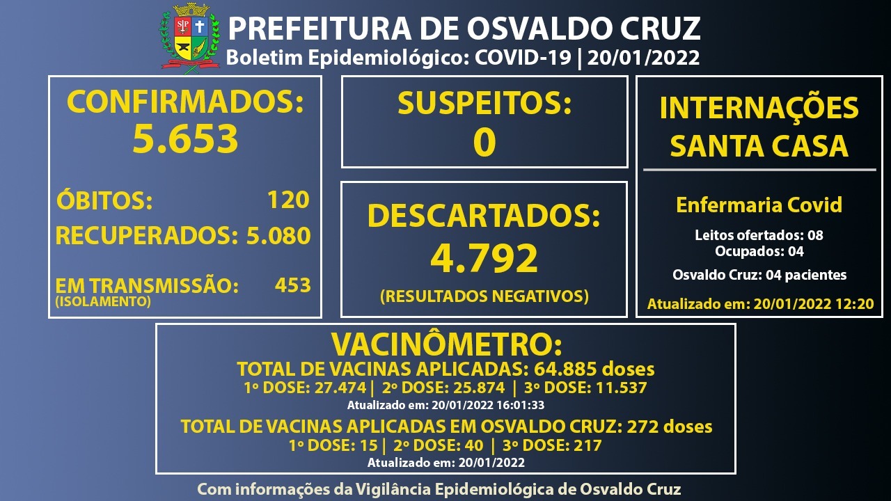 De acordo com o Boletim divulgado no final da tarde desta quinta-feira (20), Osvaldo Cruz havia registrado 5.653 casos positivos de Covid-19 desde o início da pandemia.