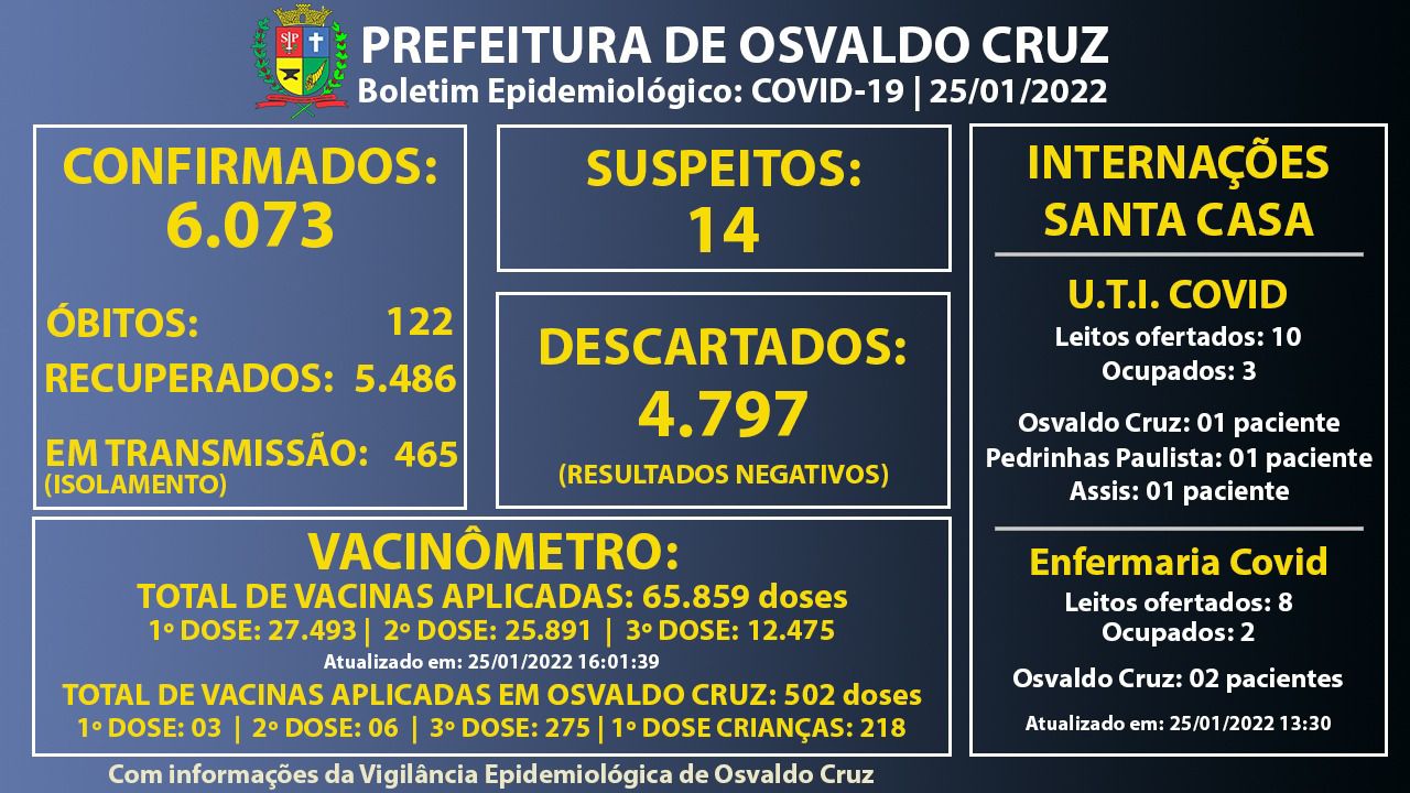 De acordo com o Boletim divulgado no final da tarde desta terça-feira (25), Osvaldo Cruz havia registrado 6.073 casos positivos de Covid-19 desde o início da pandemia.