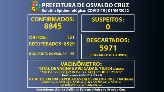 A Vigilância Epidemiológica de Osvaldo Cruz atualizou no final da tarde desta quarta-feira (01) os dados da pandemia no município.