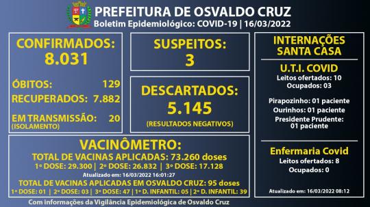 Segundo informações do Boletim Epidemiológico, Osvaldo Cruz chegou a 8.031 casos positivos da doença, com 20 pessoas ainda em fase de transmissão. São 129 mortes causadas por Covid-19 desde o início da pandemia, sendo 10 somente neste ano.